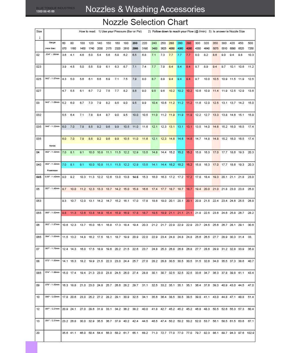 How can you choose the best nozzle? 1. Ensure that you are aware of the flow and pressure of your machine. For instance, a 21 l/min pressure washer with a working pressure of 4000 psi. 1. Locate your pressure rating at the top of the chart, or as close to it as possible. 2. Then scroll down until you get the LPM as a flow. 3. You can then follow the chart to the left, to get the correct nozzle sizing. 4. It is preferred to go larger than smaller with your selection.